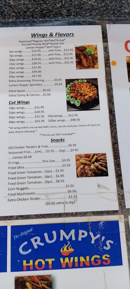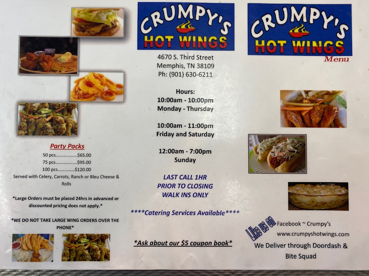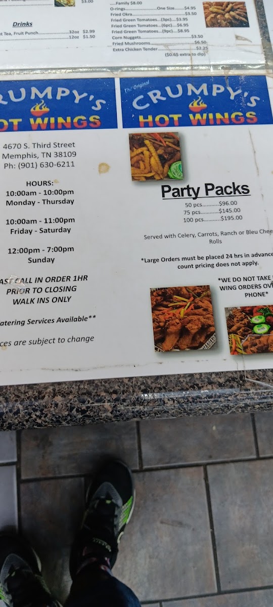 Welcome to Crumpy's Hot Wings on Third & Shelby, a must-visit culinary gem in Memphis. Located at 4670 S 3rd St, Crumpy's specializes in mouthwatering hot wings that leave patrons craving more. Their diverse menu features standout items like the family meal with twenty whole wings, large fries, and a 2-liter soda for just $49.00. Perfect for gatherings, the Whole Wing Party Packs are a hit, offering up to 100 pieces for those serious wing lovers.